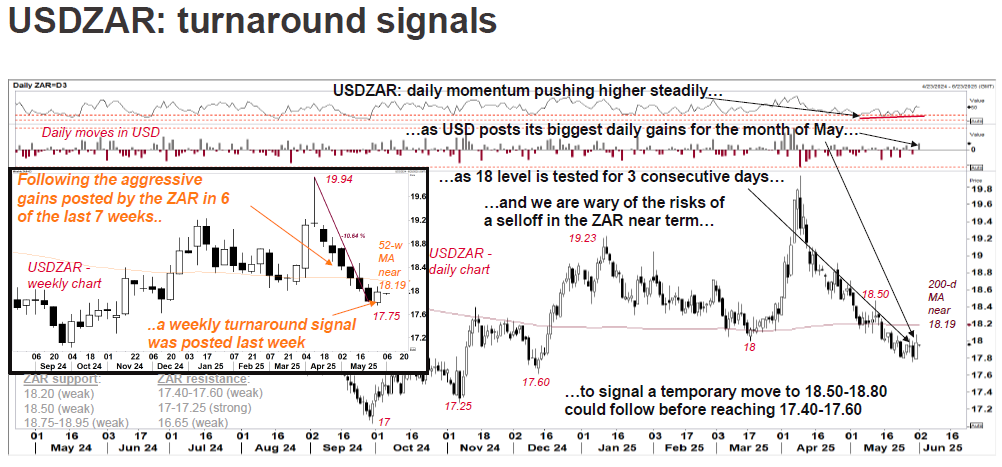 Although the ZAR posted monthly gains against majors, AUD and CNH for the month of May, we note that the weekly and daily moves are showing some cracks as discussed below. Indeed, the ZAR stumbled against the USD on Friday, and posted its biggest daily loss for the month. Coupled with the weekly turnaround signal (Piercing Pattern) and steady climb higher in USDZAR, the risks are for further losses in the ZAR near term. Furthermore, the 18 level has been tested for three consecutive days, and follow through above 18.20 (near 200-day and 52-week moving averages) would be our trigger that the ZAR could be on a more aggressive correction near term, which is our bias, with potential targets in the 18.50-18.80 area. However, we cannot rule out another attempt to drop to the 17.40-17.60 area thereafter.